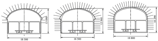 青纺医院站的结构型式在经过了比较论证后采用的是单拱大跨型式(有双层的和单层的,以双层为主)。根据地质条件的差异分为3 种不同的断面(未计单层断面),见图3[1]。
