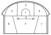 1 步先进行中部小导坑的开挖,并全长贯通,小导坑可以为后续的施工提供爆破临空面,增加爆破效果, 减少爆破震动的影响(城市中爆破施工, 震动影响是试验段的另一项研究内容),同时还具有探明地质、增加通风排烟效果的作用;第2 步进行上部中间导坑的扩挖,其跨度b 以不大于前文提到的hp 为宜。这步开挖完成后,应立即对拱部进行初喷和施作系统锚杆,以维护围岩的自身承载力;第3,4 步,拱部两侧的开挖必须错开进行,第4 步开挖应在第3 步开挖完成并施作完锚喷支护后进行,上部开挖及初支完成后,进行拱部模筑混凝土施工;下半断面5,6,7 步的施工在拱部衬砌“安全帽”的保护下依次进行。