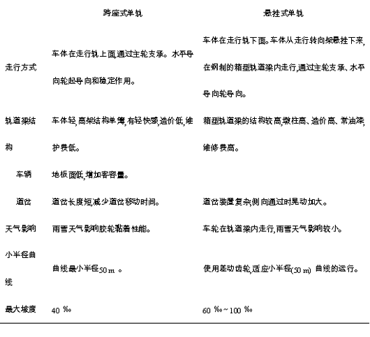 单轨交通的特点是梁轨合一。就是车辆架在一根轨道梁上运行。根据车辆走行方式,单轨交通可分为两类:一是跨座式,车辆跨坐在单轨梁上;二是悬吊式,车辆被悬挂在轨道梁之下。目前应用较多的跨座式单轨系统的主要特点如下: