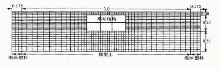 模型箱内衬厚17. 5 cm 的泡沫塑料板,用以模拟场地土易于变形的特性. 划分网格时泡沫塑料板和模型土均被离散为四边形单元,车站结构模型离散为梁单元,并在泡沫塑料板与土体、土体与车站结构之间设置了接触面单元. 接触面单元由法向弹簧、切向弹簧、抗拉元件和滑片组成,滑片剪切强度采用莫尔-库仑准则检验.