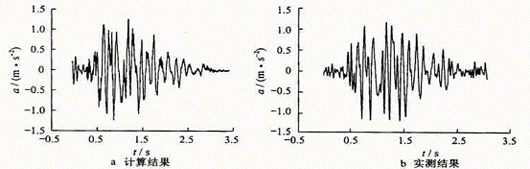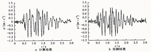 图5 车站结构模型底部测点的加速度时程计算结果与实测结果