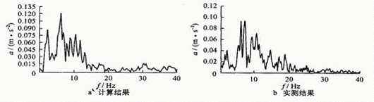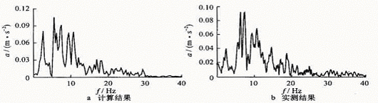 图6 车站结构模型底部测点的加速度富氏谱计算结果与实测结果