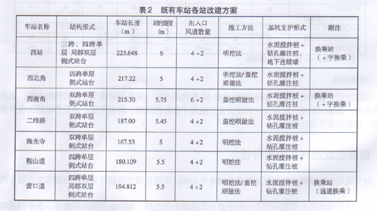 改变原有车站结构,调整柱网,保证车站侧站台宽度并向一端或两端扩建,使有效站台长度增至120m,以能满足停靠6辆车编组的列车长度需要。车站高度基本采用既有站标准,并按《设计规范》要求增加必要的设备房间、风道、出人口数量及宽度等(贝表2)