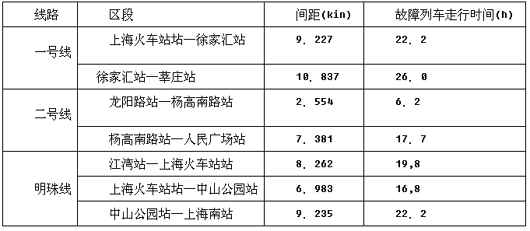 根据2000年5月一2001年12月的上海地铁运营部门的日报显示,期间共发生故障列车救援事例18起,其中一号线14起,二号线3起,三号线1起。造成列车最大间隔时间达到54分钟,最短也有18分钟,平均最大间隔时间都在30min以上。