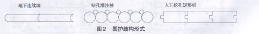 根据市二宫站所处的地面环境、地下管线分布,隋况、基坑开挖深度和工程地质特点,针对基坑围护结构的形式采用人工挖孔桩、钻孔灌注桩和地下连续墙的方案进行了综合技术经济分析比较。断面形式见图2围护结构形式。