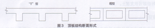 由于车站无柱区为单跨框架结构,各层板(梁)跨度大,净跨达到15.7m,建成后需上覆土体及承受汽车动荷载,其受力和变形非常大,在以往的地下工程中这种大跨度结构是不常见的。为了满足结构受力和变形的要求,在结构形式选择与计算分析时,针对顶板采用两种结构方案进行比较:一是顶板为横向T形梁体系的框架结构,二是顶板为预应力箱梁的结构体系。断面形式见图3顶板结构断面形式。