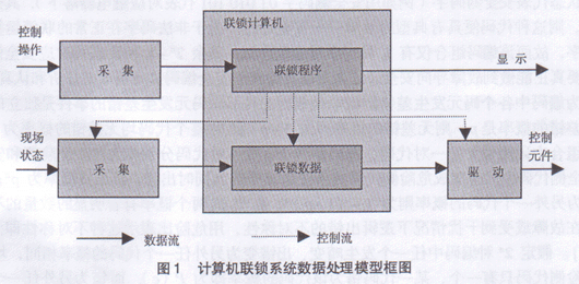 图1是一个从安全角度去考虑的计算机联锁系统的框图,实际上也是计算机联锁系统的一个安全性模型,只是仅从保障安全的角度把计算机联锁系统描述成为一个典型的数据处理系统。对于计算机联锁系统来说,保障安全就是保障框图中的数据流和控制流这两种信息处理的安全;退一步讲,即便信息处理发生错误也不会导致危险的后果。