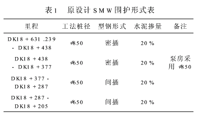 (2) 原设计:DK18+631.239~+438.1采用Φ850劲性水泥搅拌桩,每孔插700×300×14×20型钢围护。优化为:DK18+631.239~+571.239采用Φ850桩,隔一孔插两根700×300×13×24型钢围护;DK18+571.239~438.1采用Φ850劲性水泥搅拌桩,隔孔插700×300×13×24型钢围护,DK18+438.1~DK18+377Φ650劲性水泥搅拌桩每孔插500×300×14×20型钢围护,优化为650劲性水泥搅拌桩隔孔插500×300×11×18型钢围护。