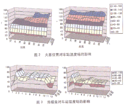 利用CFD通过有效空间范围的三维几何模型的建立、数据化网格的划分、差分格式的确定以及边界条件的设置,可以对地下空间的相关环境因素和参数进行模拟计算。总体而言,CFD通常包含如下几个主要环节:建立数学物理模型,数值算法求解,结果可视化。经过对结果的比较、分析,可以总结归纳出影响地下空间环境控制的各种因素,从而可以有针对性地采取相应的解决措施和办法,以便对地下空间环境进行有效的控制。它能够解决SES软件解决不了的一些问题。例如,我们利用CFD通过对地铁车站火灾工况进行模拟计算,根据得出的计算数据和直观形象化的结果(图2、3)可以分析出火灾强度、火源位置、燃烧时间、烟气流动、排烟形式及排烟量等对地下车站内部空间环境的影响,由此可以制定有效的防排烟措施和人员疏散方案,保证火灾情况下地铁车站内的乘客及工作人员的安全撤离,同时为消防人员创造扑灭火灾的条件。类似这些直观形象化结果的比较和分析都是SES软件目前所不能做到的。SES软件虽然对地铁的地下车站、区间隧道以及铁路、公路隧道具有较强的适用性,而CFD则可以适用于包括地铁在内的所有地下空间,具有更广泛的应用范围和领域。