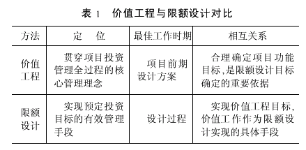 在项目投资管理过程中,价值工程与限额设计两种手段的关系见表1。