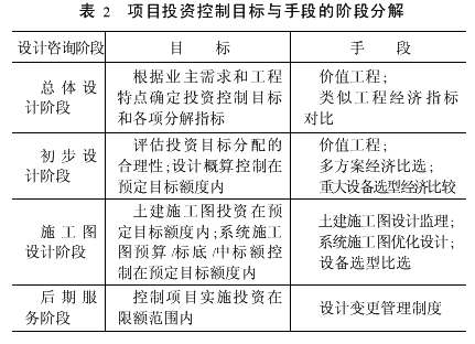 项目投资控制工作总目标为:在满足功能需求、质量标准的基础上,设计投资控制在预定目标范围内。项目投资控制目标与手段的阶段分解见表2。