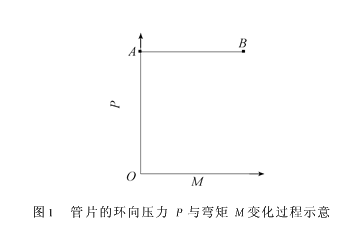 在该地铁工程中,注浆引起每环管片的环向压力约为900~1080kN。浆液凝固后,由于周围土体出现松弛,管片的环向压力会在短期内变小。之后,由于竖向土压力与横向土压力通常不等,管片受力还会进一步变化,在这个过程中,管片上可能出现弯矩。当变形和受力趋于稳定后,管片的环向压力约在700~800kN。我们近似地认为,管片的受力沿着图1中的曲线OA-AB变化。