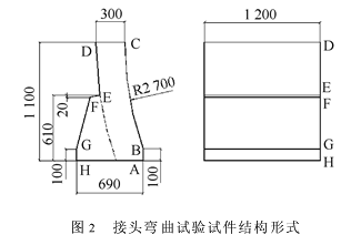 试验选用的A型管分为粗筋和细筋的两种,前者的环向受力钢筋和子午线方向的主要受力钢筋均为直径是20mm的Ⅱ级钢筋,后者的这两类钢筋均为直径是18mm的Ⅱ级钢筋。由于工程中直接使用的管片不适于用来进行接头弯曲试验,需要特殊制作试件。试件的外形尺寸如图2。它相当于把原管片缩短后又附加上了一个牛腿。试验用的试件由两个如图2所示的小试件组装而成(见图3a),小试件之间直接采用工程中使用的方法进行连接,即在接头处用两个圆弧形螺栓连接。