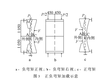 人们习惯上约定,引起管片内侧拉应变增加、外侧压应变增加的弯矩为正弯矩,反之为负弯矩。为了在接头处施加正、负弯矩,试验采用了两种加载方法。施加负弯矩的方法见图3a、图3b,竖向荷载作用线MN处在接触面几何形心B点的外侧,偏心距为e。竖向荷载在接头处产生的弯矩与水平荷载产生的弯矩方向相反。施加正弯矩的方法见图3c,竖向荷载作用线处在接触面几何形心的内侧。同样,竖向荷载和水平荷载产生的弯矩方向也是相反的。