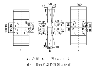 竖向相对位移的测点布置见图4,在A1与A2、B1与B2、C1与C2、D1与D2、E1与E2、F1与F2、G1与G2和H1与H2之间测量相对位移。通过测取这些位移可以得到管片接头处不同位置上的相对转角,见表1。此外,还对附加偏心距进行测量。