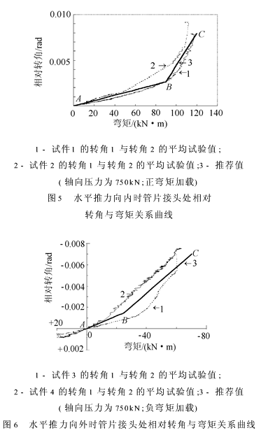 摘 要:对某城市地铁管片环向接头的弯曲变形特性进行了试验研究。加载采用两套设备,一套用来施加环向荷载,另一套用来施加弯矩。加载方法是先施加环向荷载到750kN,然后维持环向压力不变,施加弯矩。分别得到了在正弯矩作用下和负弯矩作用下管片接头处的弯矩-相对转角关系曲线。每条曲线大体上分为两个部分,分别对应于环向接触面在张开前的变形过程和张开后的变形过程。