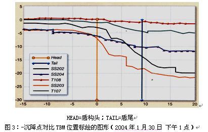 初步60m取得的沉降读数令人关切。有一个随着隧道深度增加,沉降跟着增加的趋势。数据表明挖掘面控制良好条件下,当TBM在底下通过时,在每个沉降点有表显沉降。当TBM经过后沉降停止。虽然沉降读数小(对一条隧道浅近沉降点,大到15mm),由于靠近一个泊车场,步骤收紧,加强地层注射系统和灌浆系统。当TBM经过,沉降读数就有一个明显的改善,地表平均沉降大约6mm。