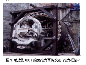 与此TBM装配的同时,洞口展开安装工作,浇注一块泥板,用了连接梁组成框架。为了考虑到理想的始发推力800t,有必要锚固该框架到基岩,使用到众多的岩锚,推力框架焊接到浇注框架。框架就位后,才开始装配TBM。