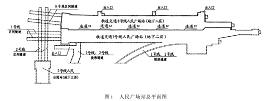 根据车站的使用功能及周围环境的情况,在车站位置选择时将两座车站紧贴平行设置,线路布置紧凑,换乘路线最短。由于两座车站共用同一侧墙,在设计中必须考虑降低工程实施期间对西藏路和人民广场地区环境影响,尤其施工期间必须保证1号线人民广场车站的安全正常运营。同时也必须考虑在车站建成后可能给原1号线车站带来的不利影响,故本车站设计和施工难度都较大。
