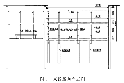 根据基坑开挖深度,标准段区域约为13.2m,端部区域约为15.7m。结合周边环境情况,经分析计算,采用4道钢支撑全逆筑施工,支撑竖向布置见图2。