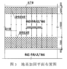 由于基坑最终开挖面位于④淤泥质土层中,且基坑开挖最终面与原1号线底板下表面持平,基坑开挖势必对原车站会产生一定的侧移。为使原1号线车站,侧移限制在规定的范围内,必须根据④层土体特性,选择合适的加固方法以及加固形式和加固后土体的强度。根据本工程的具体特点,综合各方面因素,考虑采用旋喷桩加固,加固型式主要为裙边加固。本加固之所以没有采用常规的抽条地基加固的方式,主要是为了防止旋喷抽条地基加固可能在旋喷的过程中对原车站产生较大的影响,因此加固方式采用裙边加固。车站地基加固平面布置见图3。