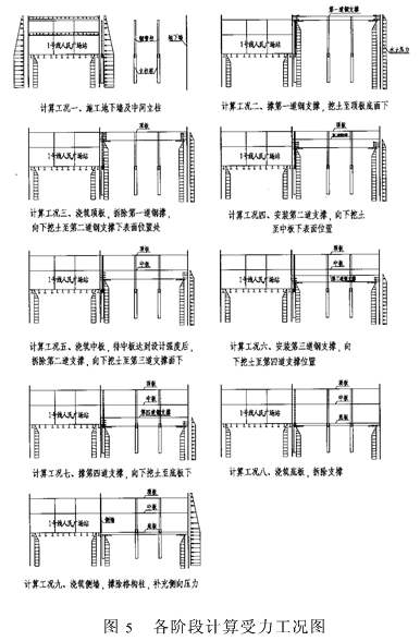 本站除端头井区域外,均采用单层侧墙,即地下连续墙即作为施工阶段的围护结构,又是永久结构的受力结构。标准段结构计算时,模拟结构施工各不同阶段及使用阶段不同受力情况,采用增量法计算结构受力分析计算。根据本站支撑竖向设置以及支撑架设、拆除、结构浇筑的顺序,模拟施工阶段受力情况,进行分析计算各阶段结构。各阶段计算受力工况如图5。