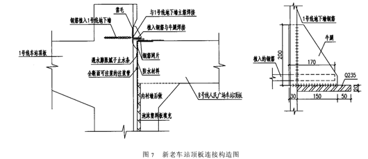 结构防水设计原则以防为主,多道防线,因地制宜,综合治理。本车站结合具体实际情况,采取的主要技术措施有:①采用抗渗标号为S8混凝土,提高结构自身的抗渗能力;②车站顶板及诱导缝、施工缝处设加强防水构造措施;③新旧车站连接位置采用相关的防水技术措施。
