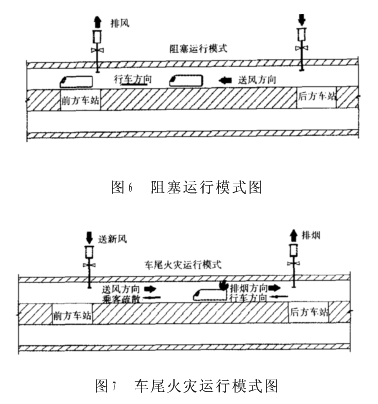 由于原隧道通风系统阻塞运行时,虽然初始温度较原设计有约2℃的提高,但改善了原设计隧道风机运行时的通风效果,从总体来说原设计基本应能满足阻塞运行的要求。当发生区间阻塞情况时,可开启阻塞区间后方车站同一条隧道两端的两台隧道风机送风,前方车站一台隧道风机排风,并相应打开前方车站的车站轨道排风系统。通风方向与行车方向一致,同时屏蔽门应保持关闭状态,以保证区间的气流组织,如图6所示。并且在设置有射流风机或推力风机的特殊区段,还可运行相关辅助设备强制组织气流方向,保证区间隧道的平均温度及风速满足相关标准。