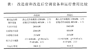 车站加装屏蔽门后,将车站与隧道隔成两个空间,极大地减少了车站冷量泄漏,从而大幅度地减少了车站的冷负荷,按远期运行条件计算,各车站公共区的冷负荷比原系统有较大减少,包括计入送入隧道的冷量后,平均到每台组合式空调器的冷负荷基本上比每个车站原有一台组合式空调器冷量略有减少,总的送风也略有减少。以目前正在改造的黄沙站为例,改造前和改造后的空调设备和运行费用比较如表1所示。