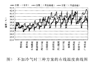 从图4中可以看出隧道温度已有较大改善,但方案三仍然偏高,方案一、二的隧道温度基本控制在37℃以下,且方案二略优,故设计推荐采用方案二,即活塞风道只与车站隧道的出站端相连通。