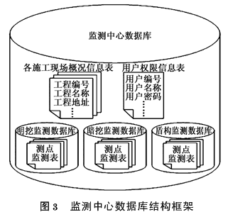 除了上述现场监测数据库的内容,还要包括各施工现场概况信息表,以及用户访问权限信息表,监测中心数据库结构如图3所示。