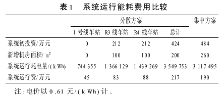 由表1可得出,初投资方面,徐家汇站采用集中制冷站比各新建站分别设置制冷机房增加投资60万元,机房面积增加60m2,如果考虑1号线既有系统的造价,集中制冷站方案的初投资会低于分散方案;运行能耗费用方面,采用集中制冷站,系统每年可节电43.2万kWh,年节约运行费用27万元,经济效益显著,并且运营管理与维护人员相对减少,设备维护集中方便,可进一步节约运营管理与维护费用;社会效益方面,可以取消大量分散的冷却塔及膨胀水箱,减少噪声污染,优化环境。