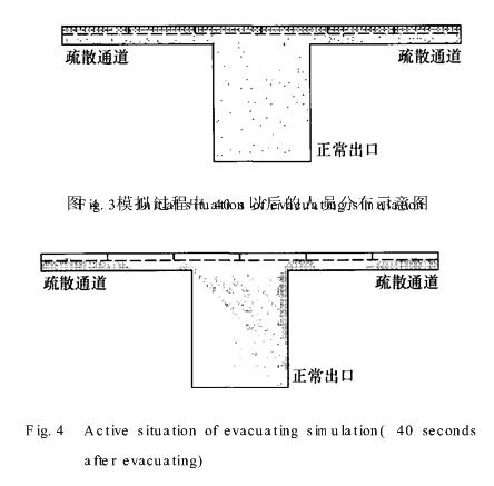 在模拟过程中发现,当疏散通道关闭时,对人员疏散造成的影响不仅仅是减少了出口的数量,更为严重的是会导致大量的人员聚集在出口附近,大大增强了疏散的“瓶颈”现象,从而降低了疏散的效率.另外,由于乘客并不知道疏散通道是否是打开的,如果人们到达疏散通道附近发现其关闭再返回来寻找其它出口的话,就会造成“反向流”的现象,导致疏散效率降低.