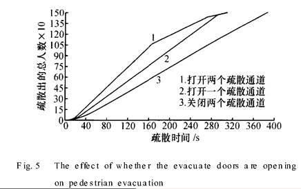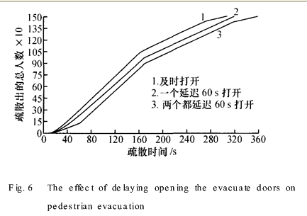 从图中可以看出,在同一时间内,3条图线所显示的从所有出口疏散出去的总人数的关系:图线1>图线2>图线3.也就是说,当延迟打开疏散通道时,由于没有及时有效地利用每个出口,所以导致在同一时间内,疏散出去的总人数减少,疏散的总时间明显增加.