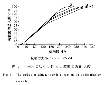 (3)出口的吸引力不同,则人员疏散所用的时间也有所不同.正常出口与疏散通道的吸引力存在一个最佳值,如果通过指导人员有序的进行疏散,使每个出口的人员分配取得最佳值,将会有效地避免出口的“瓶颈”现象,减少人员疏散的时间.