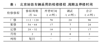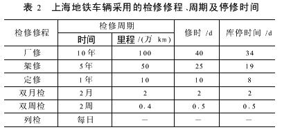 我国目前通常采用的检修修程、周期及停修时间是基于日常维修和定期检修相结合的检修制度即预防性计划修制度而确定的,表1、表2分别是北京市及上海市采用的检修修程、周期及停修时间。