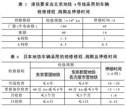 而港铁要求在北京地铁4号线车辆基地采用的检修修程、周期及停修时间是基于均衡修和定期检修相结合的检修制度确定的,与日本采用的相似。表3、表4是港铁要求在北京地铁4号线车辆基地采用的以及日本采用的检修修程、周期及停修时间。