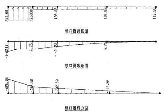 竖井井身采用喷射混凝土与锚杆、钢筋网、格栅钢架联合支护,竖井井身喷砼厚度通过计算在不同深度范围分别采用500及550mm两种厚度,满足要求。锁口圈下土层和隧洞范围局部全风化夹层辅以Φ42注浆管进行注浆。考虑到250吨吊机起吊重和地面沉降的控制要求,对锁口圈进行了加强设计,竖井锁口圈的地面超载按:盾构吊出井的两侧为100KN/m2(考虑吊机及起吊的盾构及重),其余按30KN/m2计。锁口圈考虑结构自重、井身自重及超载,按弹性地基梁计算,计算模型如下: