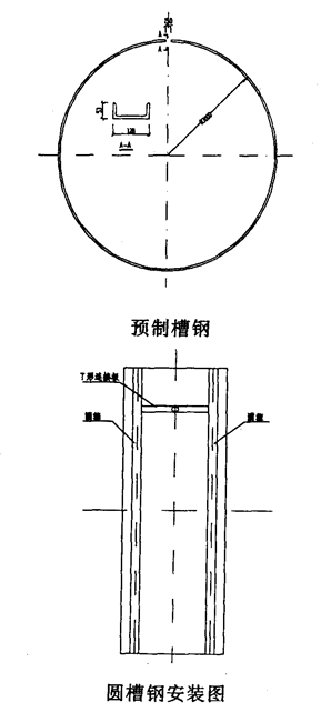 2)整环安装后拧紧全部横向螺栓,用预制的半圆形槽钢组成圆箍抱住管片两端,用葫芦收紧后用钢板焊接牢靠。同时将中上部的3个管片吊装孔打穿,做一"T"形钢架插到吊装孔里,"T"形钢架两端与管片两端圆箍焊接。