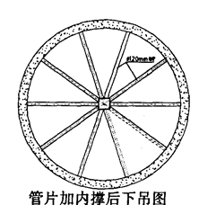 针对出现的问题,采取了如下补救措施:1)首先核对限界,检查隧道错台后内径空是否满足限界要求。在确认限界满足要求后, 对错台的管片在外围外包钢筋网,替代对接不上的纵向螺栓,满足隧道纵向受力要求;2)采取在盾构管片内均匀布置12支Φ120mm的可调节的钢管内支撑,控制下吊过程中管片的变形。加撑图如下: