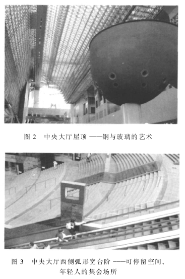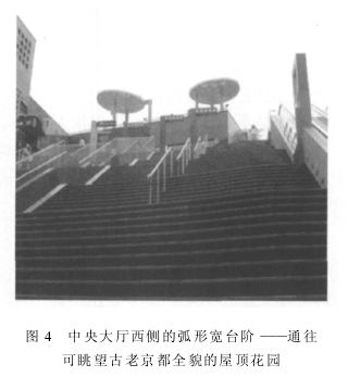 这个位于城市空间结构结点上的超大尺度的厅,也是建筑的核心,它联系着室内、室外及各层的使用空间。大厅空间本身是一个整体,没有分层的感觉;但随着大厅地面向东西两翼不断升高,在各个层面高度上与各层的使用空间都形成回路,使得位于不同层面上的使用空间都融于大厅,即所谓“聚集场所”;而且成为传统城市空间的延伸,消除了高层建筑的感觉。大厅向东西两侧的升高方式不同:东侧是呈台地状,各台地之间通过自动扶梯联系,尽端是旅馆区围合的屋顶广场;西侧设置了一个巨大的弧形宽台阶,形成连续上升的坡面(见图3、4)。位于西侧的百货店在各层都有开口与宽台阶相连,宽台阶尽端是位于百货店和停车场屋顶上的开敞广场。半开敞的大厅通过“地形”变化,促成了各功能区的融合,创造了可停留空间,也暗示了京都优美的自然地势。