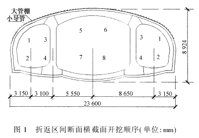 折返区间采用双侧壁导坑法开挖,横截面开挖顺序见图1。开挖定义如下: