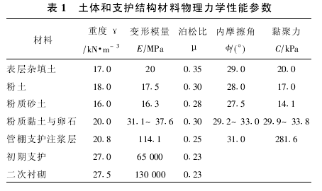 根据实际勘测资料,土体特性分为4层。①第1层:表层杂填土,厚1.4m;②第2层:粉土,厚5.7m;③第3层:粉质砂土,厚4.3m;④第4层:粉质黏土与卵石,厚38.6m。土体参数见表1。
