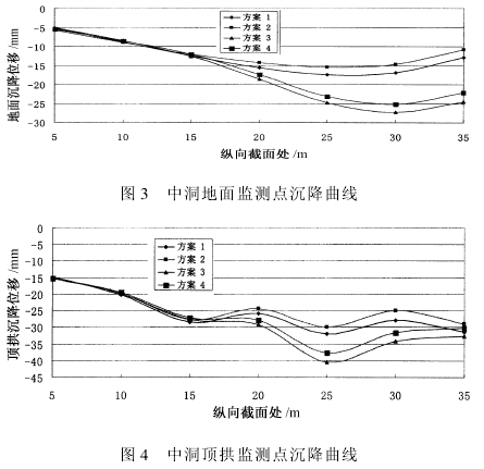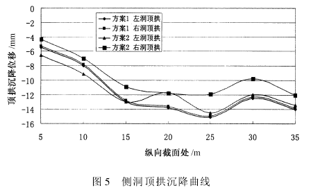 从图3可以得出沿着隧道方向中洞地面沉降逐渐增大后又有减小的趋势,隧道两端地面沉降小,而在中间附近地面沉降大。这是由于隧道端部土体围岩压力比较小,受前后开挖的扰动也比较小,而隧道中部围岩压力比较大,受前后开挖土体的扰动也比较大的缘故。隧道前段开挖,开挖面应力释放,开挖面前部土体向开挖面倾斜,从而使得中洞地面沉降最大点一般在两端中间偏后一些,方案1和方案2大约在截面25m处,方案3和方案4大约在截面30m处。分析图4可以得出沿着隧道方向中洞顶拱沉降先逐渐增大后减小, 再增大最后又减小,沉降变化有一种波动的趋势,但总体趋势还是两端沉降比较小,中间沉降比较大,这和其地面沉降趋势相一致,只是在数值上顶拱的沉降比地面的沉降要大一些。这种变化趋势也和实际工程情况相吻合。分析图3和图4,后两种方案的中洞地面和中洞顶拱沉降量都要大于前两种方案,中洞地面最大沉降量后两种方案分别是前两种方案的1.6倍左右。顶拱最大沉降量是前两种方案的1.24倍左右。分析四种方案,最根本的区别在于前两种方案是侧洞开挖、二次衬砌建筑完后再开挖中洞,后两种方案是把整个工程沿着隧道方向分为前20m开挖、浇筑二次衬砌和后20m开挖、浇筑二次衬砌两段进行施工,从图3和图4可以看出在前段15m施工时,四种方案地面和顶拱沉降相差不大,而之后的沉降差距就逐渐拉大,体现在施工开挖上即为前两种方案侧洞开挖到20m处后继续开挖侧洞,而后两种方案侧洞开挖到20m,建筑衬砌,开挖中洞。前者由于先只开挖侧洞,而中洞土体形成岩柱承受上部荷载,同时也隔开两侧洞,使得在开挖过程中开挖跨度不大,使围岩有效地形成横向应力拱,有效地抑制了地面沉降,而后者侧洞开挖到20m处开始开挖中洞,开挖过程跨度较大,虽然侧洞和中洞间建有隔柱承受上部荷载,但隔柱作用面积小,不足于形成中洞岩柱所形成的横向应力拱,而又在开挖后半段20m时,由于前半段20m中洞土体已开挖掉,不能形成岩柱,结构凌空跨度很大,后半段的开挖对整个隧道结构和围岩的扰动影响就越大,所以地面沉降和顶拱沉降就越大。由此可以判断出方案1和方案2要优于方案3和方案4。对于方案1和方案2,前者由于两侧洞同时开挖,开挖面积大,对围岩及中洞土体扰动也越大,故地面及顶拱沉降略大于后者。又因为该方案属于对称开挖,所以两侧洞顶拱沉降也大致相同。而方案2为非对称开挖,左右侧洞顶拱沉降不相等,最大相差达22%,大约在截面25m处,见图5。