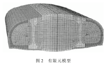 在开挖过程中,地面横向受影响范围一般为开挖掌子面洞径3倍的范围。在无水、少水情况下,地面横向沉降范围一般认为等于结构埋深,也就是从结构物边横向向外结构埋深宽度[6]。工程中侧洞开挖断面跨度为7.4m,受开挖扰动的横向范围主要在侧洞外24m之内。结构覆盖土层厚度12.54m,结构底拱埋深21.5m。综上所述,考虑到中洞开挖对两侧土体的扰动和模型边界条件的影响,确定计算模型宽90m,高50m,纵向沿着隧道方向长度40m。由于内部结构相对于整个模型显得太小,为了更清晰显示内部结构,从而未显示外围土体,见图2。
