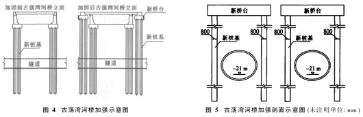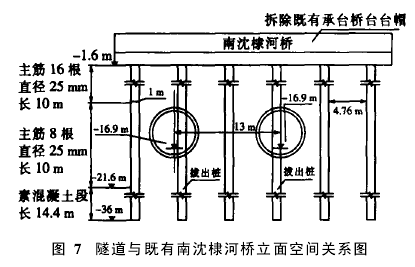 3.5.4 预留盾构隧道位置,修建新桥。重建桥梁的桩基础在避开盾构位置后,利用未拔的既有桩,在既有桩的两侧新增两根桩。既有桩基与新建台帽应连接可靠,新建的台帽需考虑拔桩后造成部分桩间距增加,加强新建承台的配筋。
