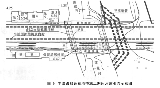 丰谭路站为杭州地铁2号线一期工程的起点站,车站位于文新路与丰谭路十字交叉口,沿文新路布设于道路下方,车站站后设折返线(兼作停车线),车站总长440m,下穿莲花河。跨莲花河桥为简支钢筋混凝土桥,基础采用钻孔灌注桩,桩径Ф1200mm,桩长35m,桩间净距3m。结合车站明挖法施工,方案拆桥后复建,围护结构从桩间穿过(先破除承台),基坑开挖时破除桥梁桩基。车站实施时的交通疏解、河流的围堰导流方案示意见图6。