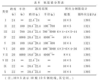 ( 2) 由于活载轴重相对轨道梁恒载较大, 故轨道梁在最不利工况组合下, 梁上、下缘应力都可能控制设计。为使梁上、下缘都有一定的压应力储备, 根据需要某些类型梁跨预应力钢筋中心适当上移, 使其更接近于轴向配束。