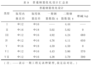 相比一期工程, 根据内力及配筋计算结果, 对二期工程轨道梁普通钢筋配置进行了优化, 详见表 9。