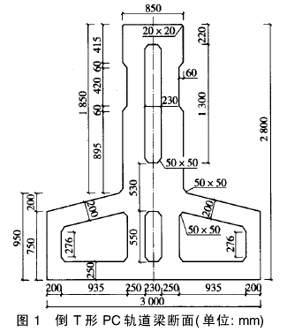 倒T形PC轨道梁是跨座式单轨交通系统轨道梁中具有突出特点的一种新型结构形式,具有跨越能力强、刚度大、噪声低、防腐性好、耐久性高的优点,为城市单轨交通跨越既有城市构筑物的首选方案之一。由于受线路平纵断面、既有城市立交桥净空和车辆限制,以及腰部安装接触网汇流牌需要,倒T形PC轨道梁的上部尺寸必须满足85cm×150cm的断面尺寸及相应的平面曲线,而且行车的净空也有特殊要求(即上述梁断面上方及左右都不能有障碍物),结构高度也受到限制。因此,跨座式单轨交通系统倒T形PC轨道梁的设计是一项全新的、具有较高设计难度的工作。